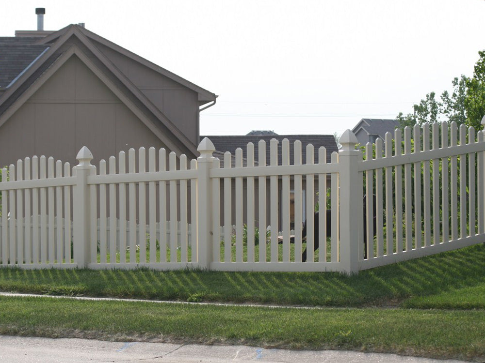 A 4' overscallop vinyl picket fence provides the same functionality as a standard vinyl picket fence, with the added touch that only a scallop could provide. Each picket on this vinyl fence is cut to the correct height in order to ensure a seamless grade above the top rails.