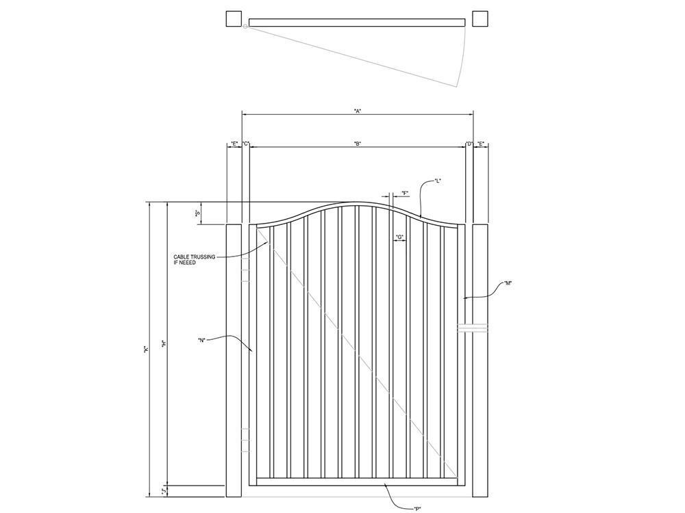 Our ornamental swing gates will transform an entrance from ordinary to extraordinary. By adding a decorative estate gate to your new or existing security fence; you will create a classy and elegant statement about your home and business. All of our ornamental swing gates are constructed of lightweight aluminum and receive a high impact coating. Our arched or overscallop smooth top ornamental gate is a real eye catcher that stands out in any existing fence line. The arched top rises in the middle creating a pleasing arch. *Please note that the gate picture represents a custom gate. Please refer to the style drawing for a more accurate representation of your gate.